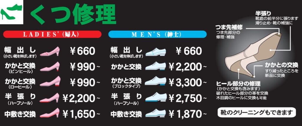 ※オールソール交換、中敷き交換、幅だしは修理に数日かかります。事前にお問合せ頂けば修理期間を確認いただけます。